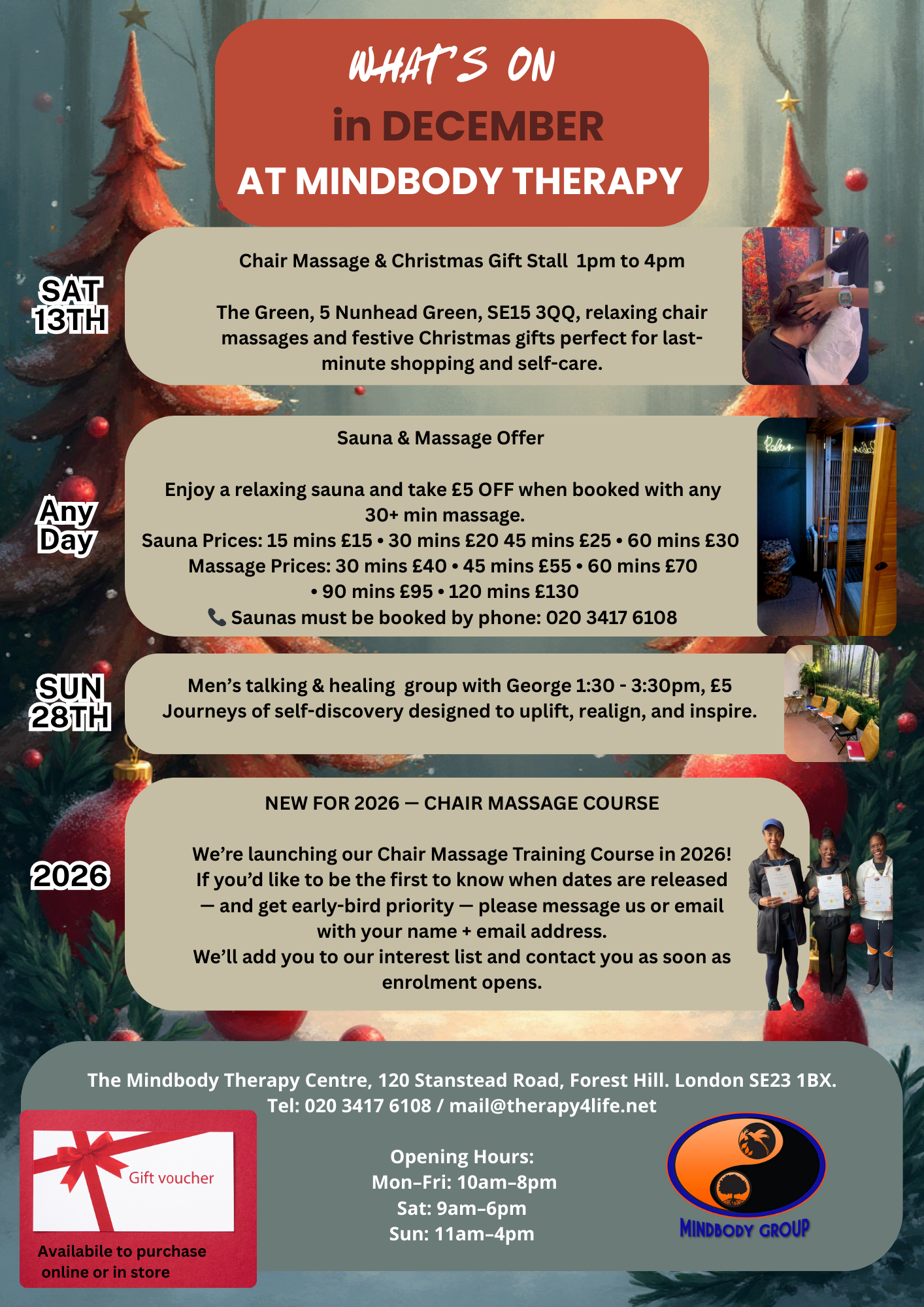 What’s on this December at MindBody Therapy. Alongside our full treatment menu at the centre, we have a few extra events and offers: